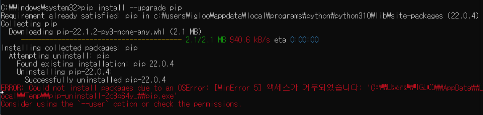 ERROR: Could not install packages due to an OSError: [WinError 5] 액세스가 거부되었습니다.
